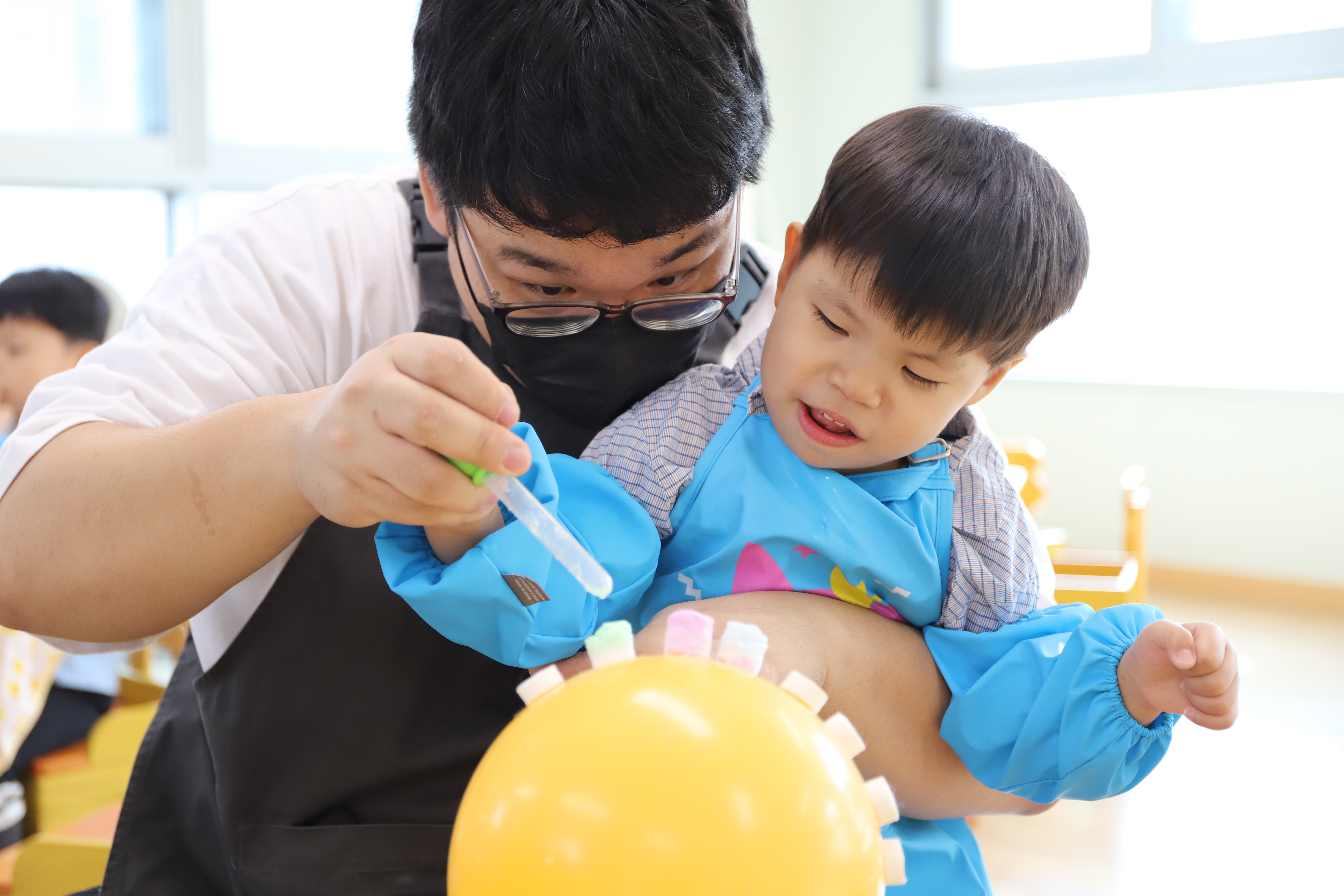 코인물티슈를 꼭꼭 붙인 후 스포이드로 물감을 뿌려주니 머리카락이 쑥쑥!