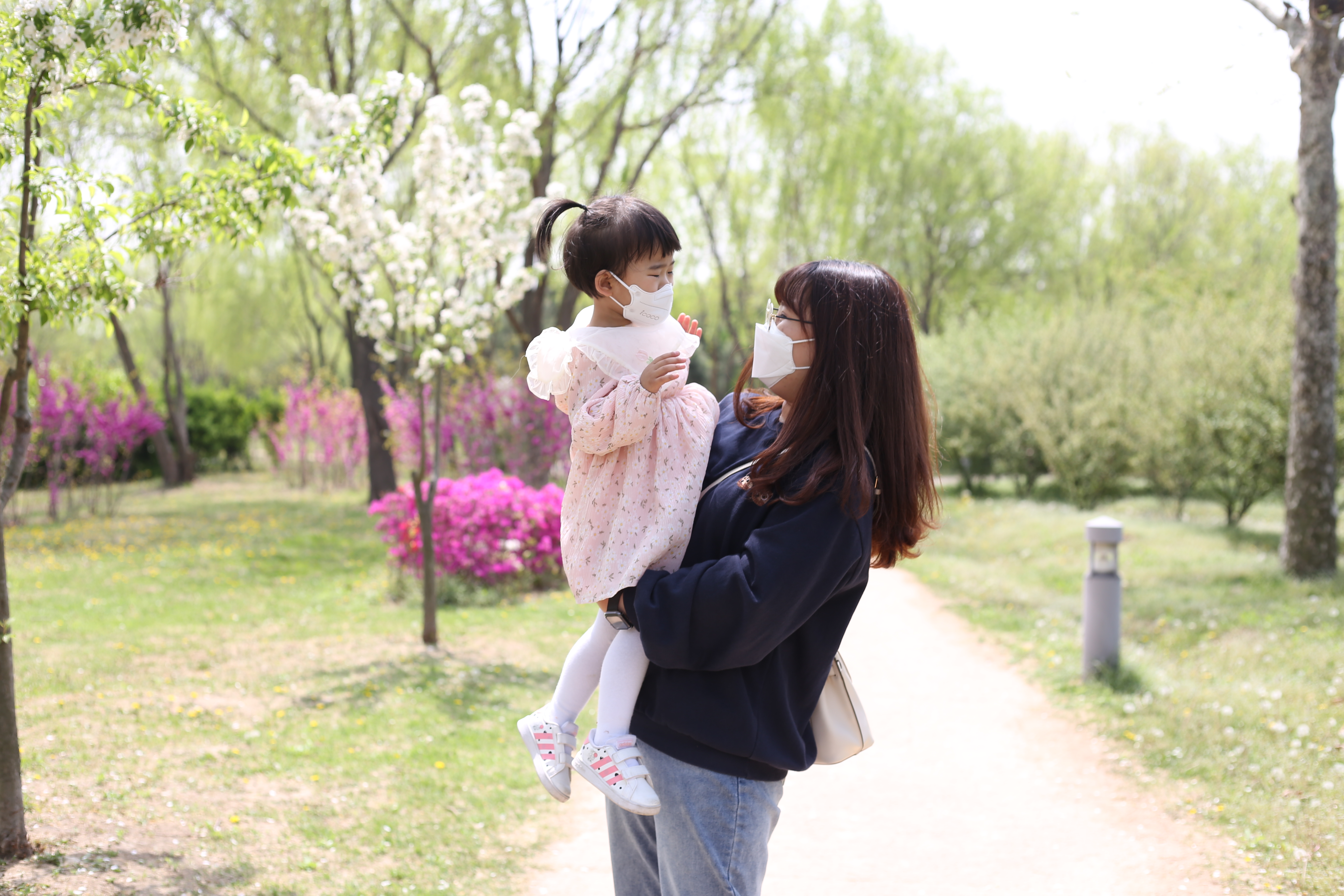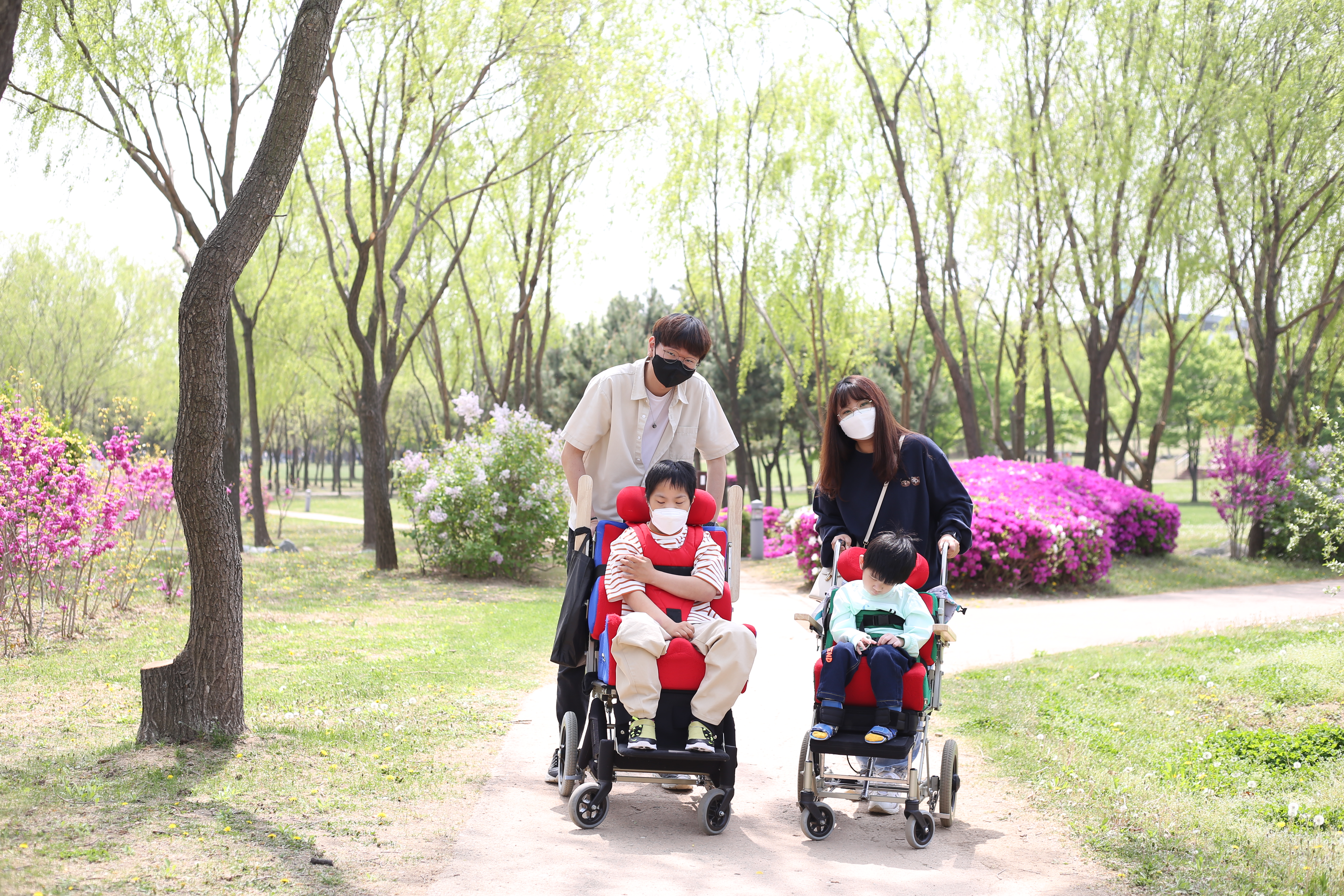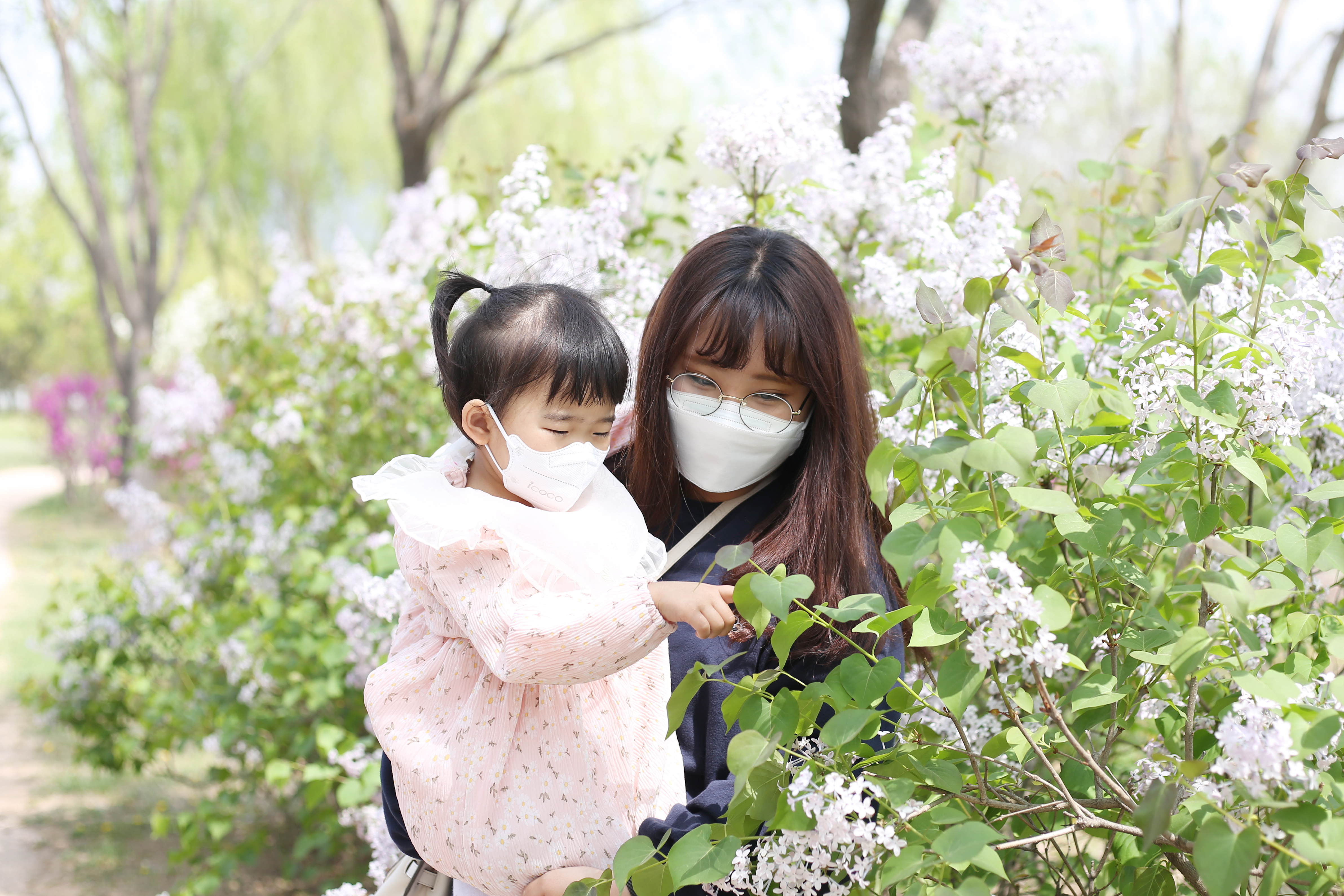 꽃이 가득한 공원을 거닐며 행복한 시간을 보내고