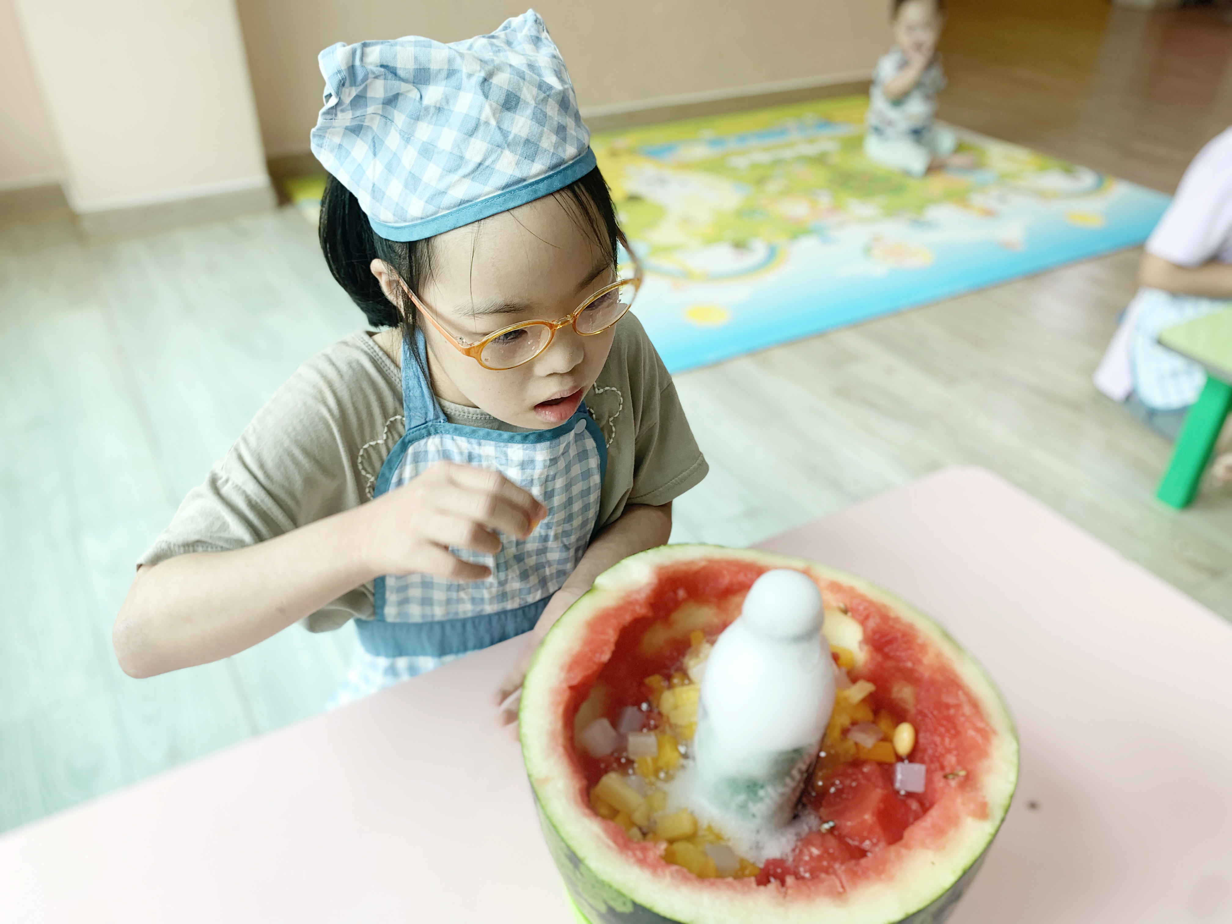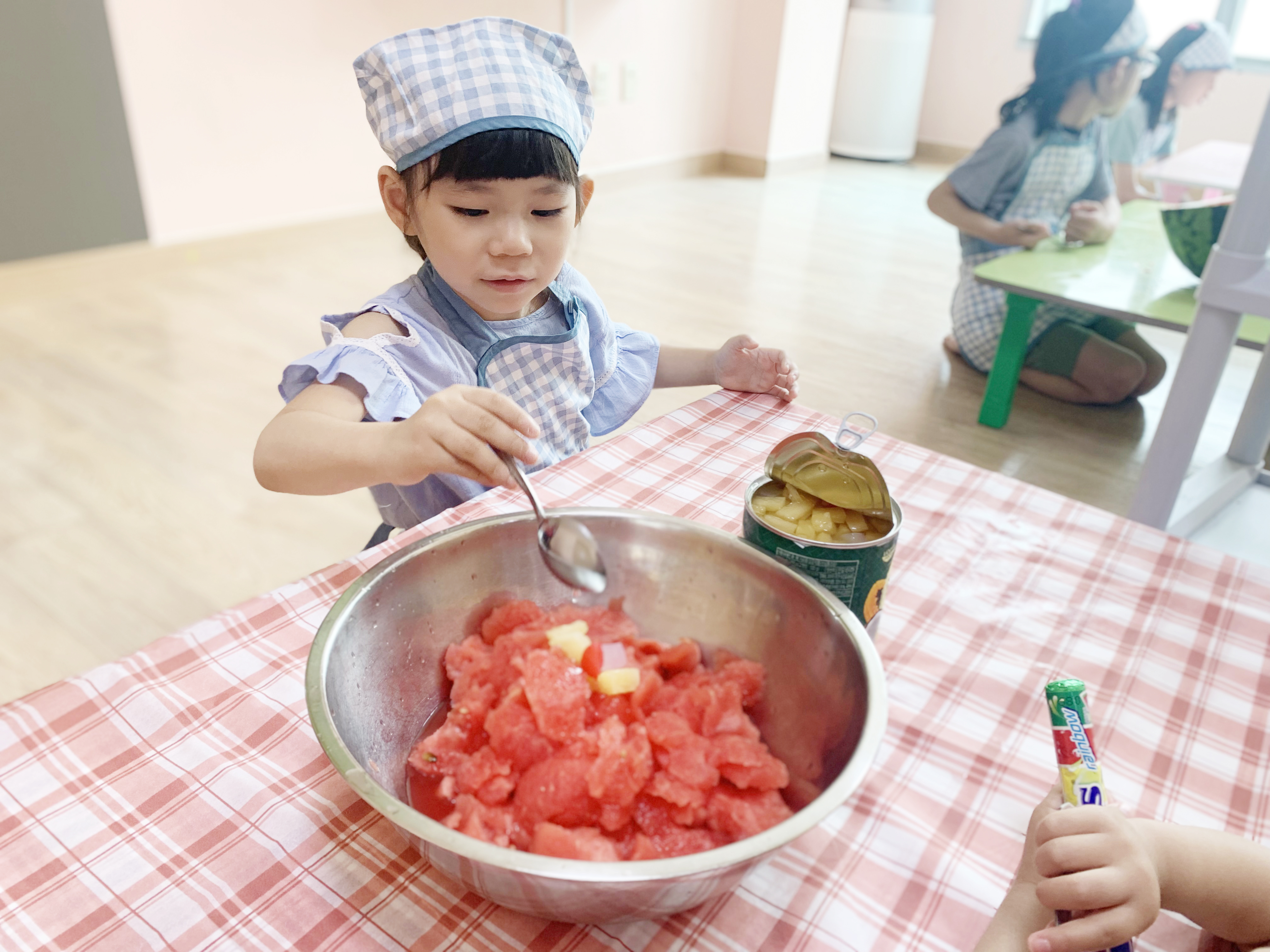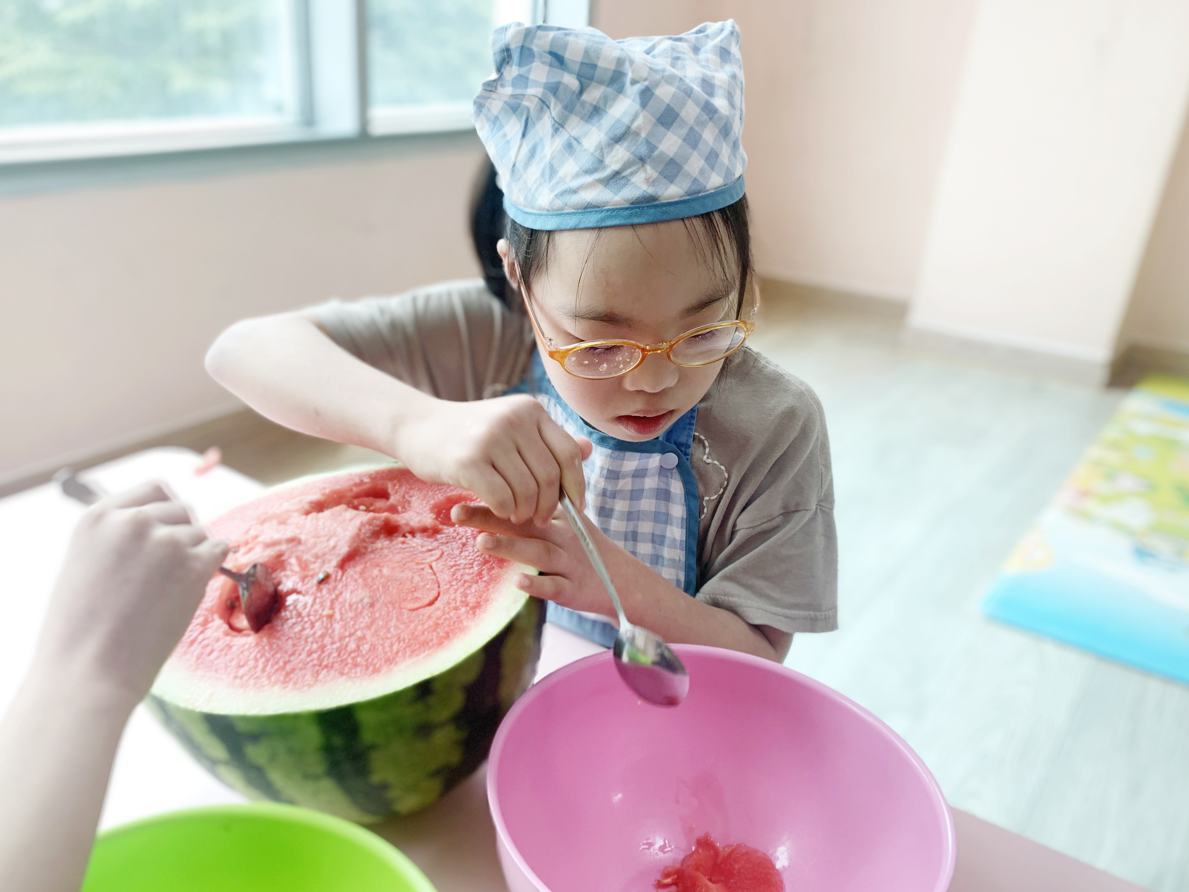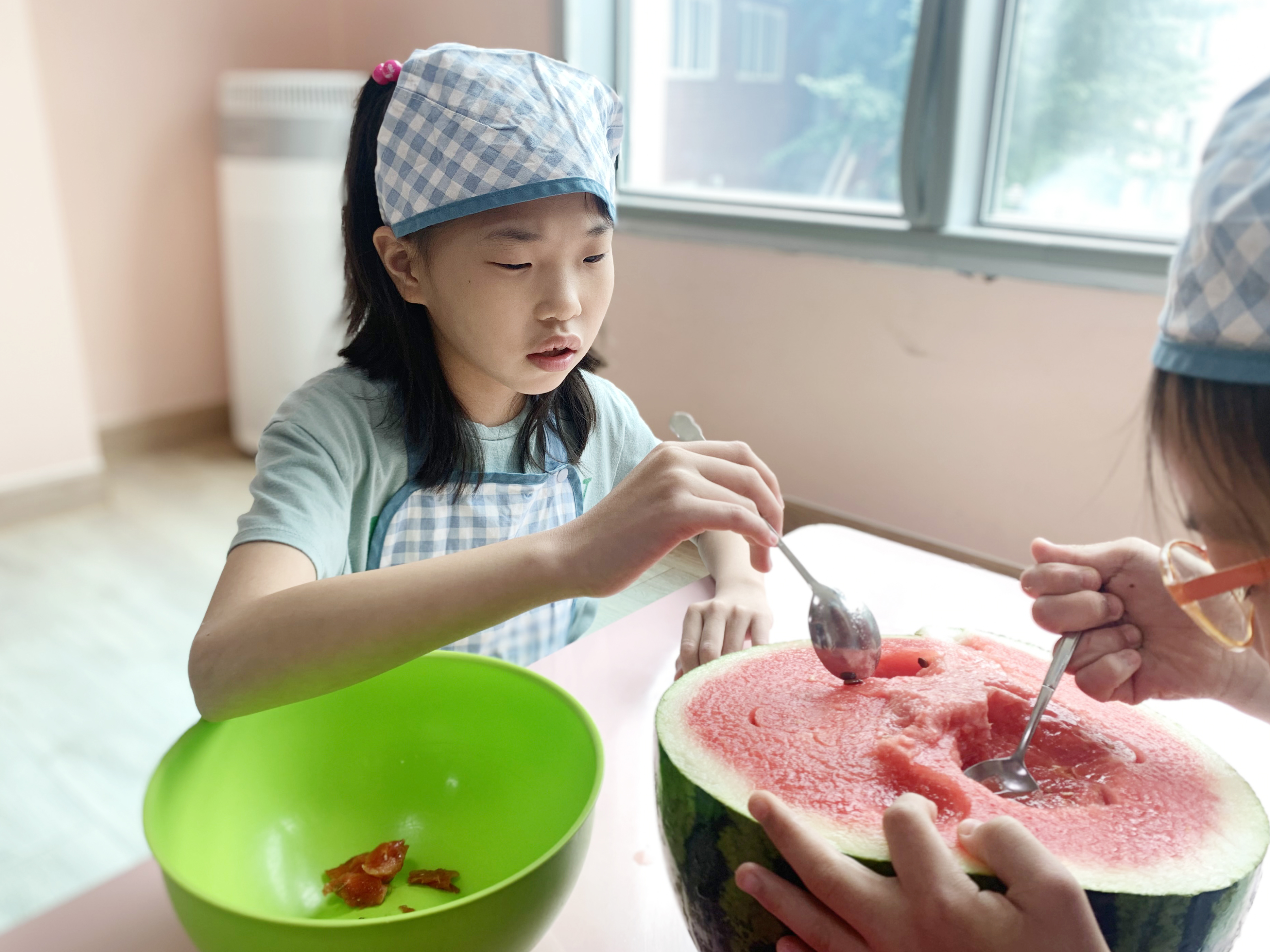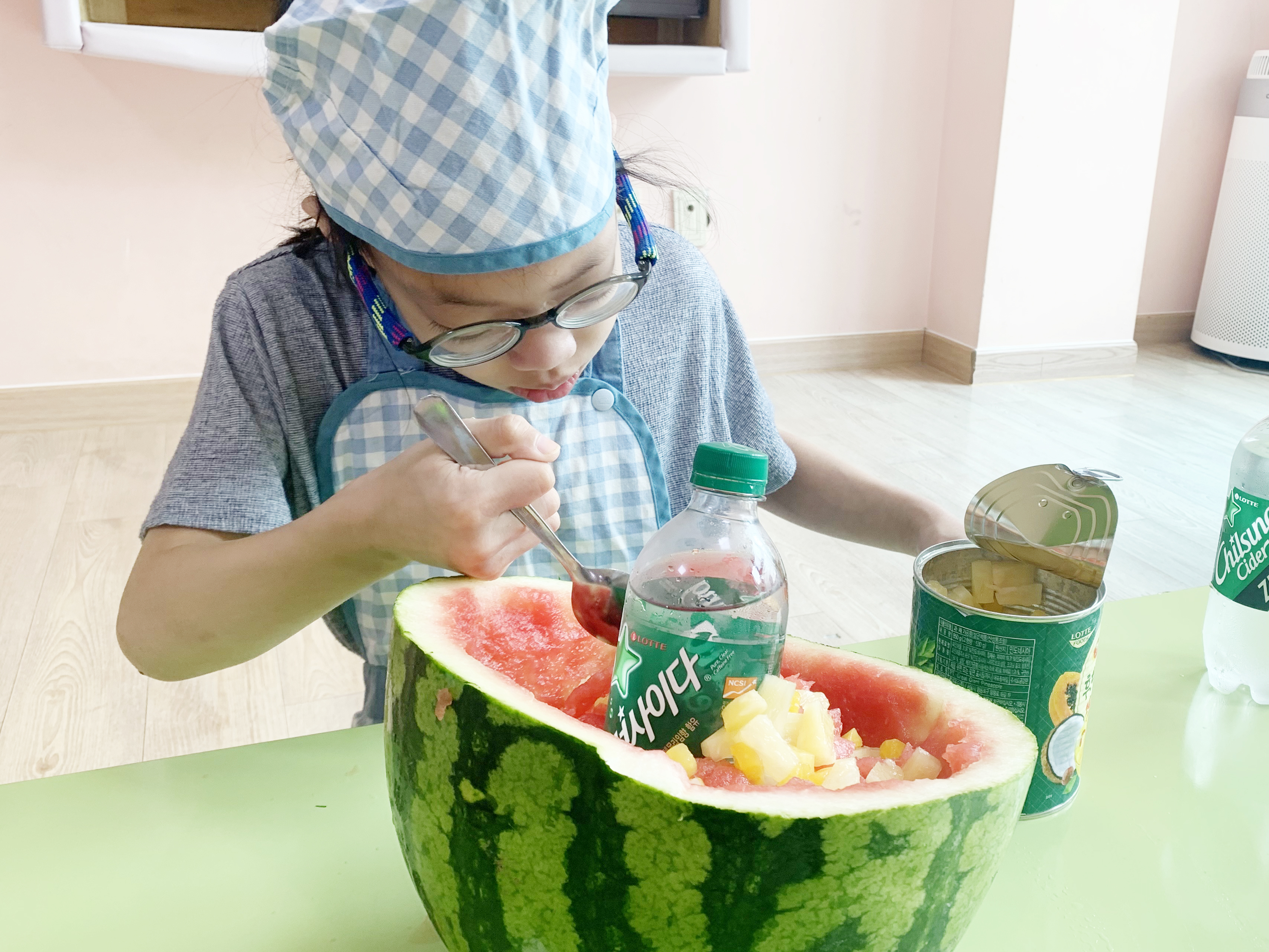 숭덩숭덩 수박을 숟가락으로 떠 내어 그릇을 만들고,
