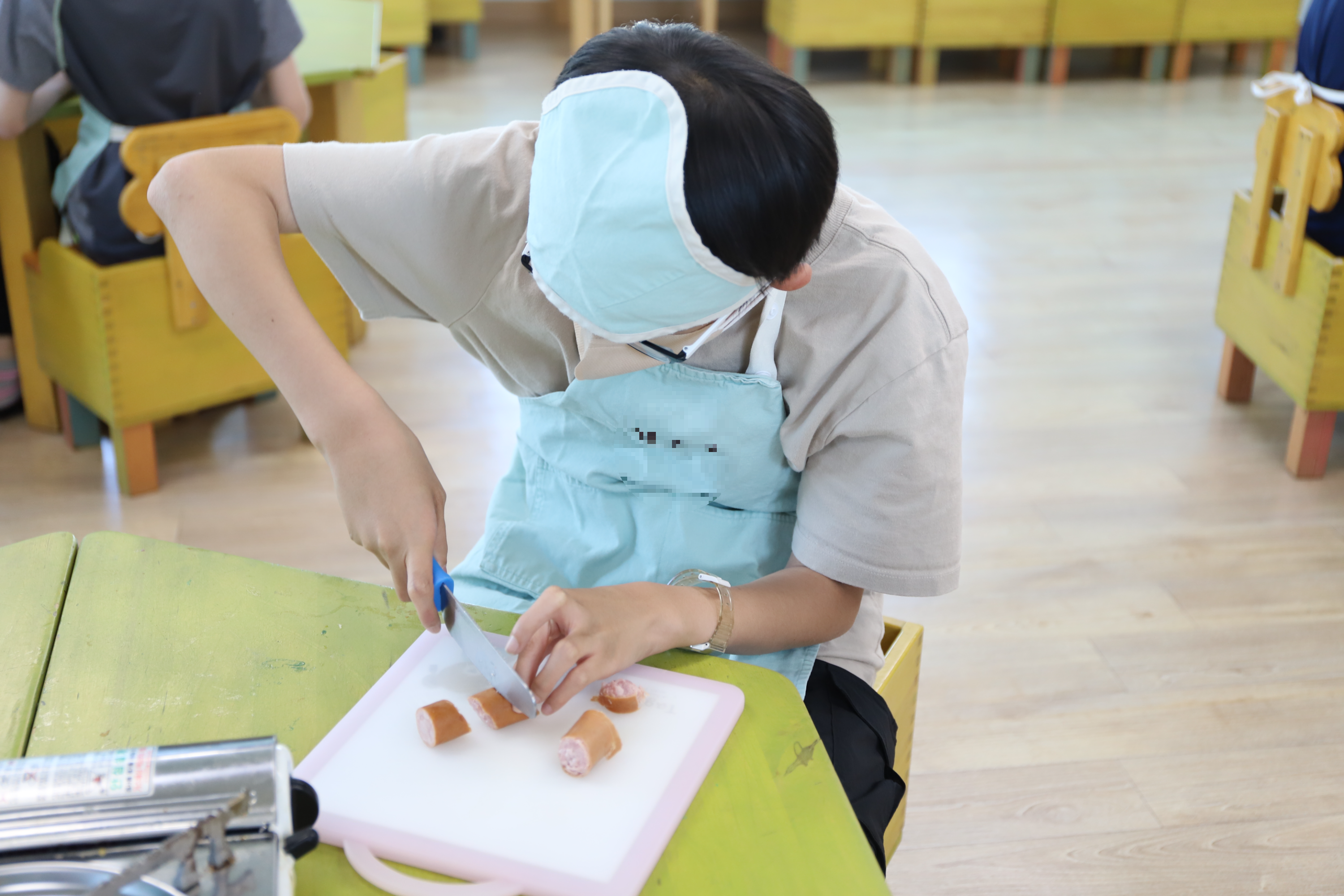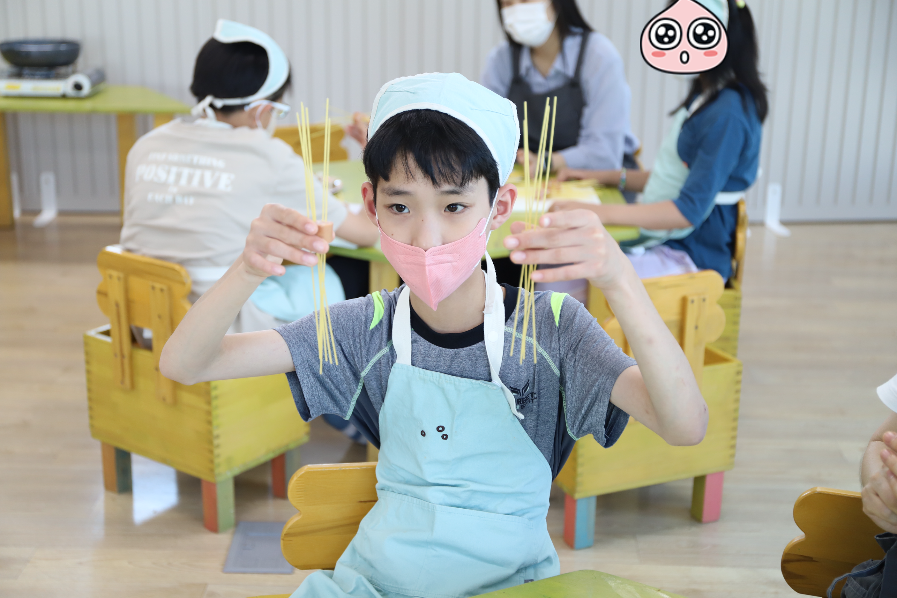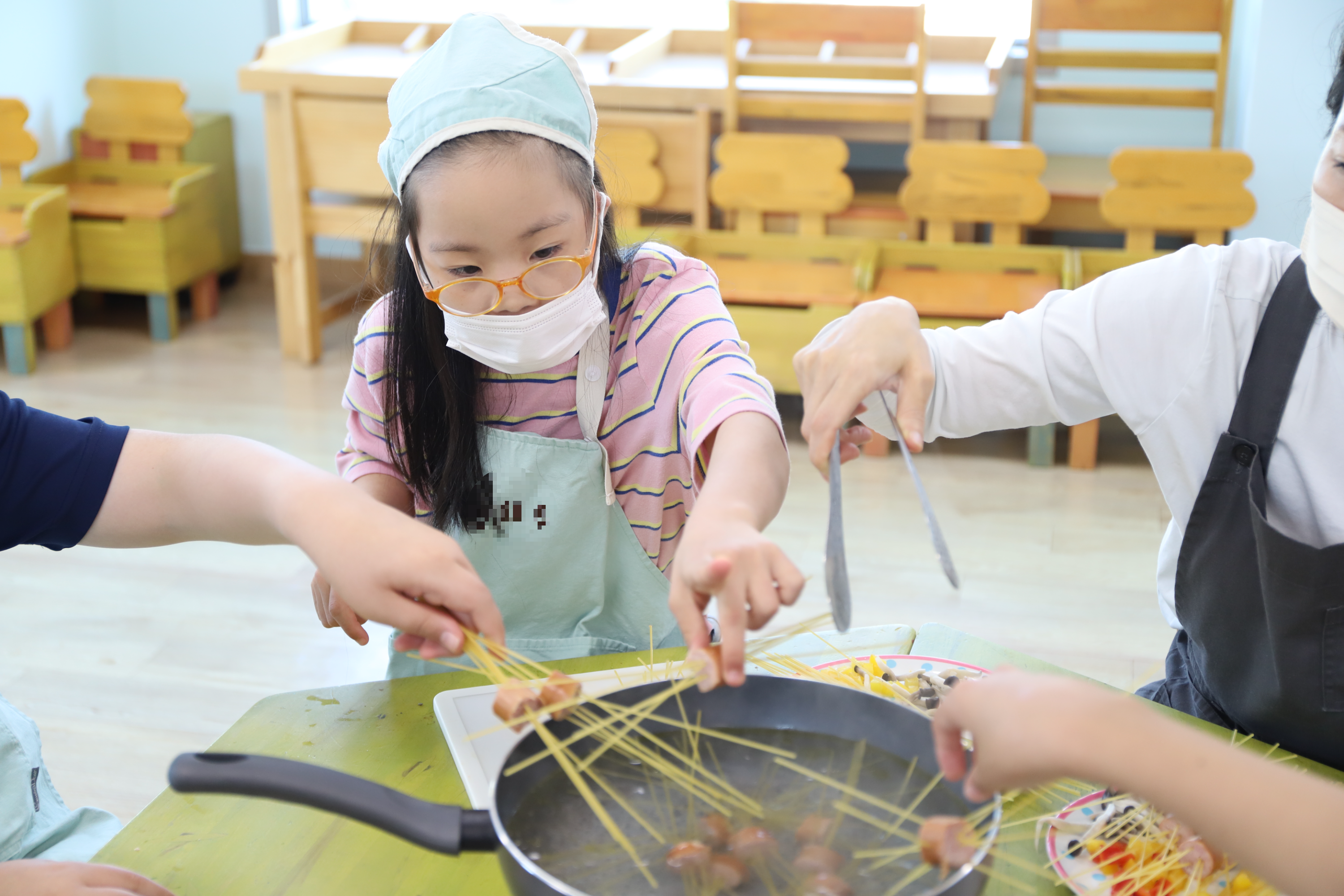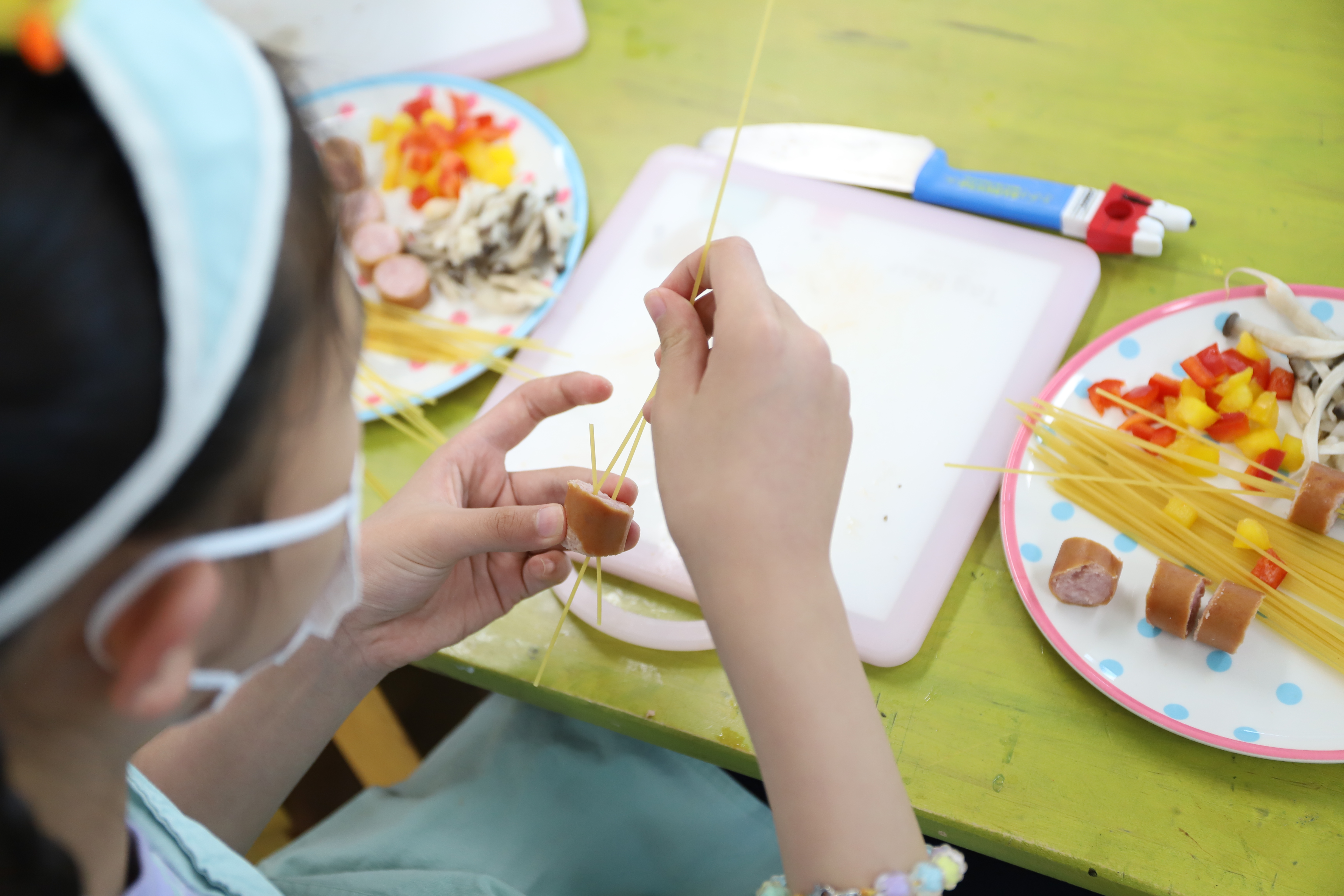 소시지를 작게 잘라 스파게티 면을 쏙쏙 꽂아봤어요.