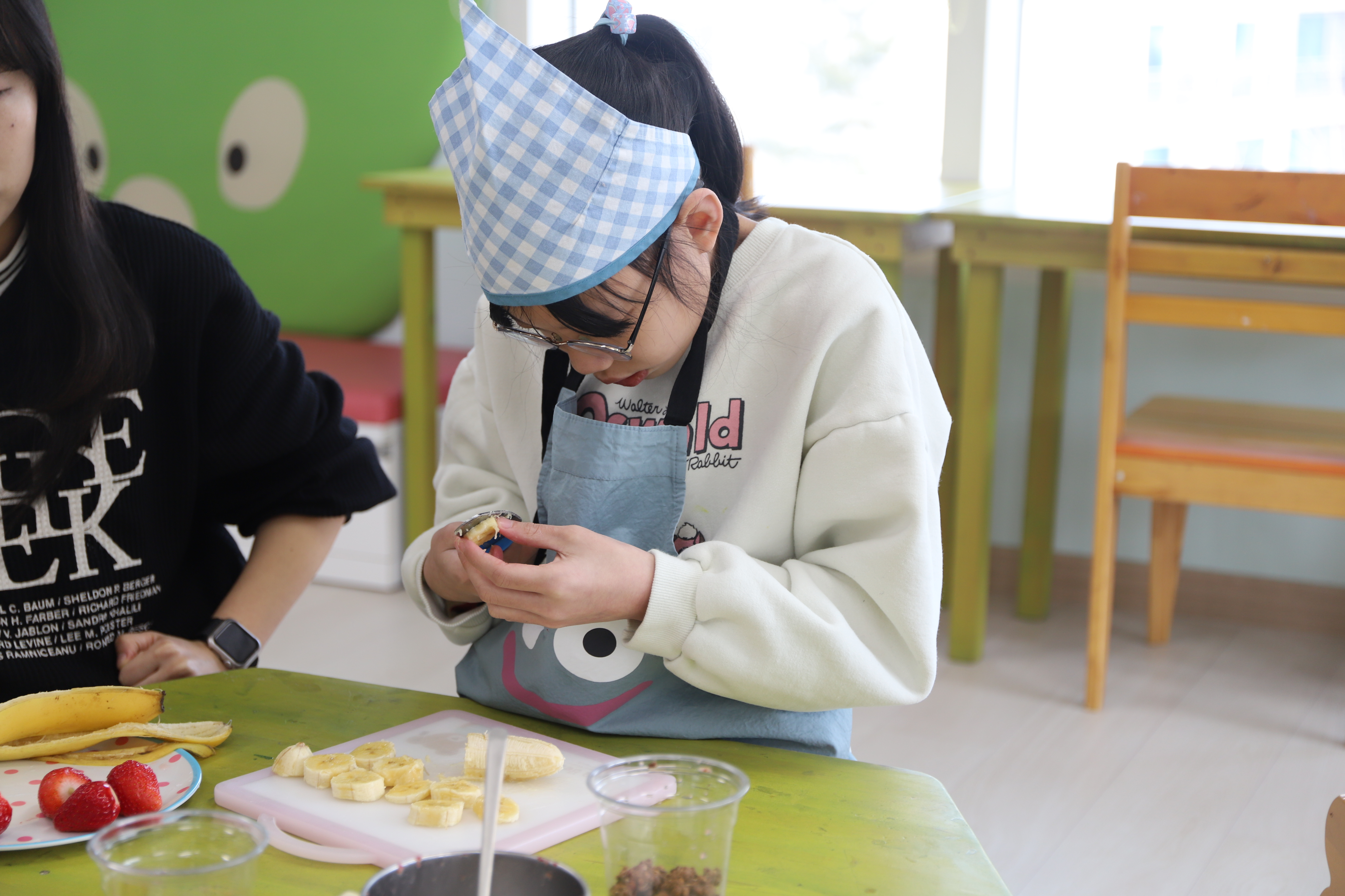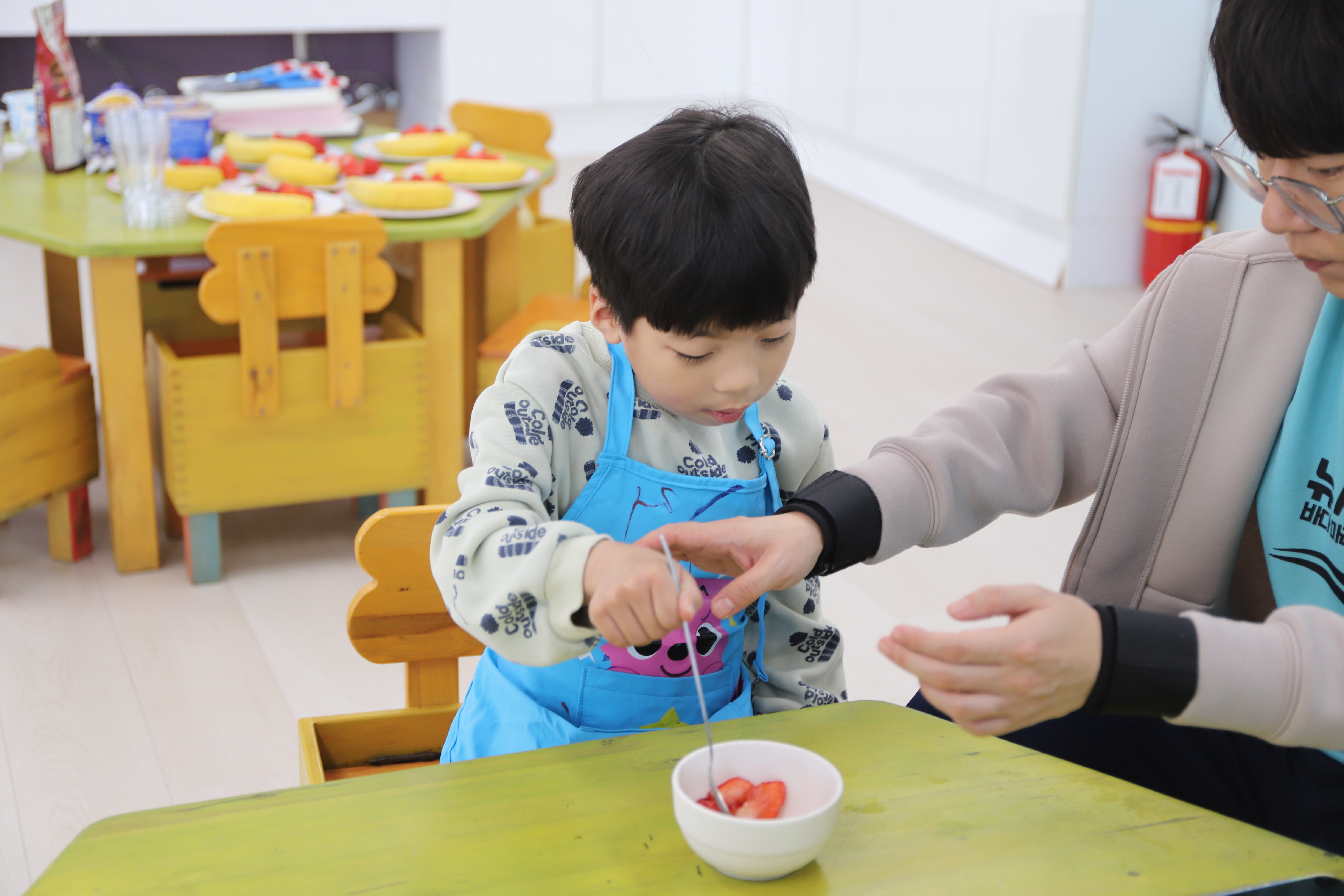 칼 사용이 처음인 친구들은 안전에 유의하며 조심조심 과일을 잘라보고