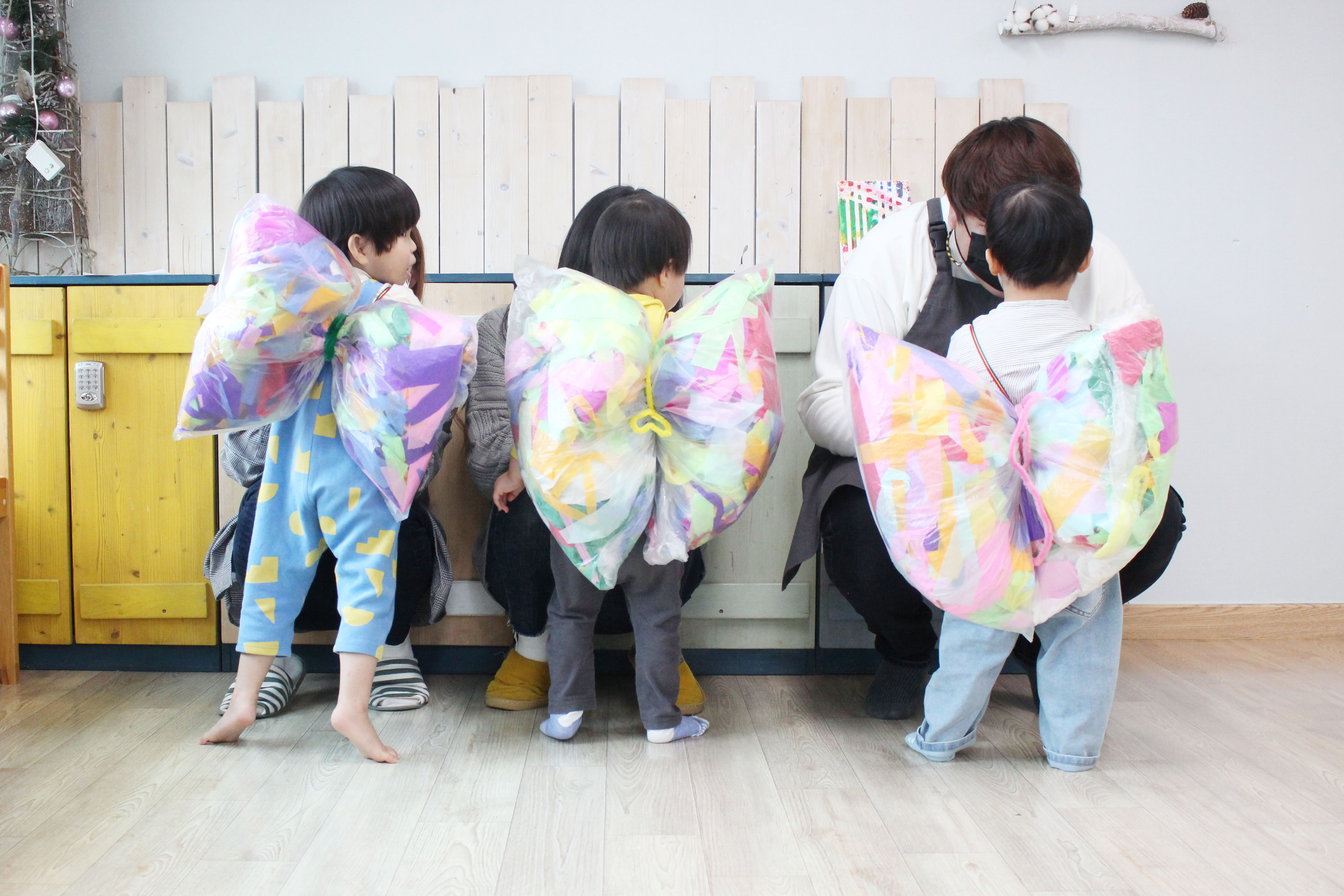 [2021.05.10] 나는 나비 색이 고운 종이를 찢고 뭉치며 즐거운 시간을 보내고 크고 작은 비닐에 모두 넣어 나비를 만들었어요. 아이들의 꿈도 나비처럼 훨훨 날아오를 수 있길♡ 설레임/천사들의 이야기 2021.05.14